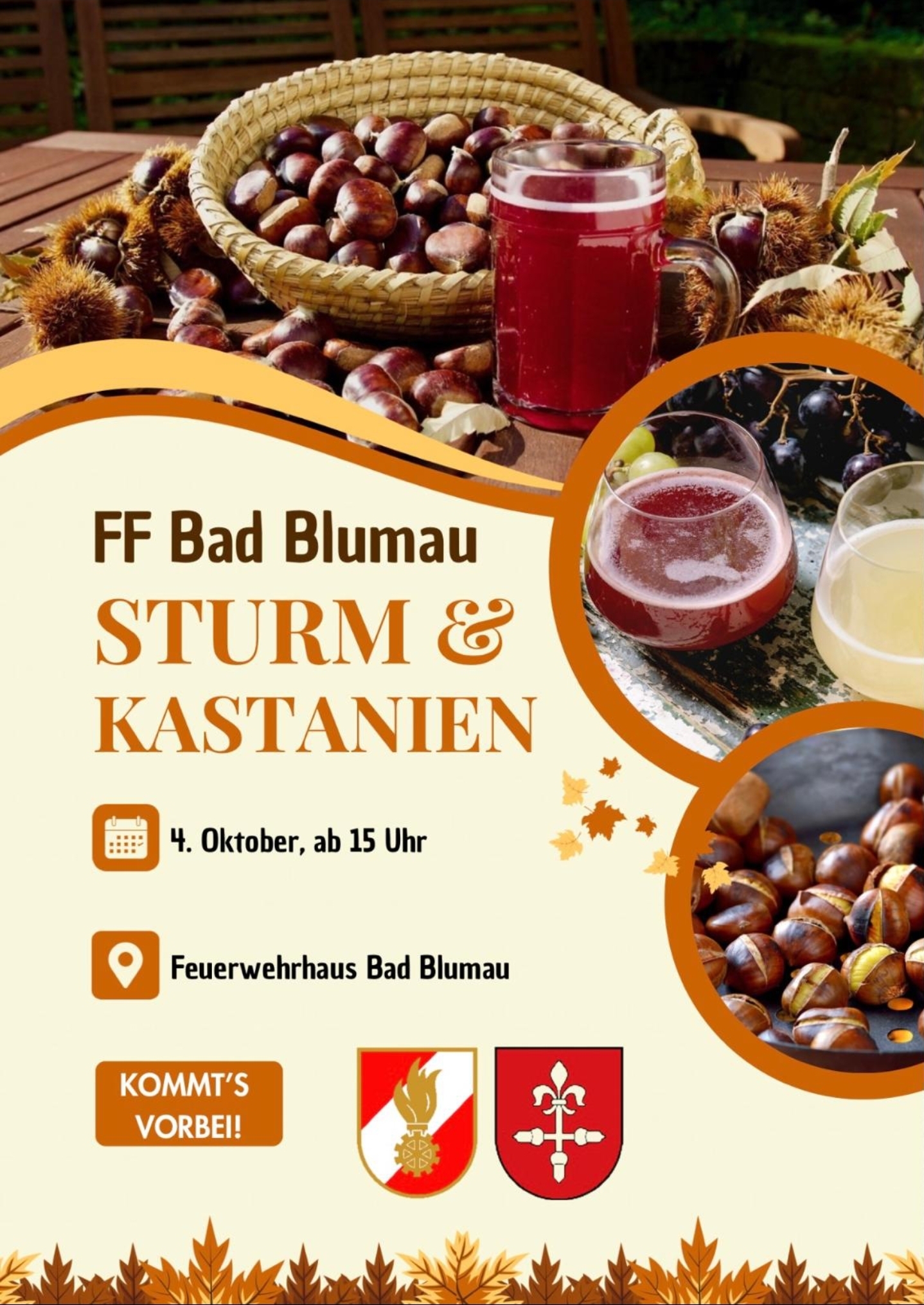 Am Samsung den 04.10.2025 läd die FF Bad Blumau wieder zu Sturm und Kastanien bei uns im Rüsthaus.